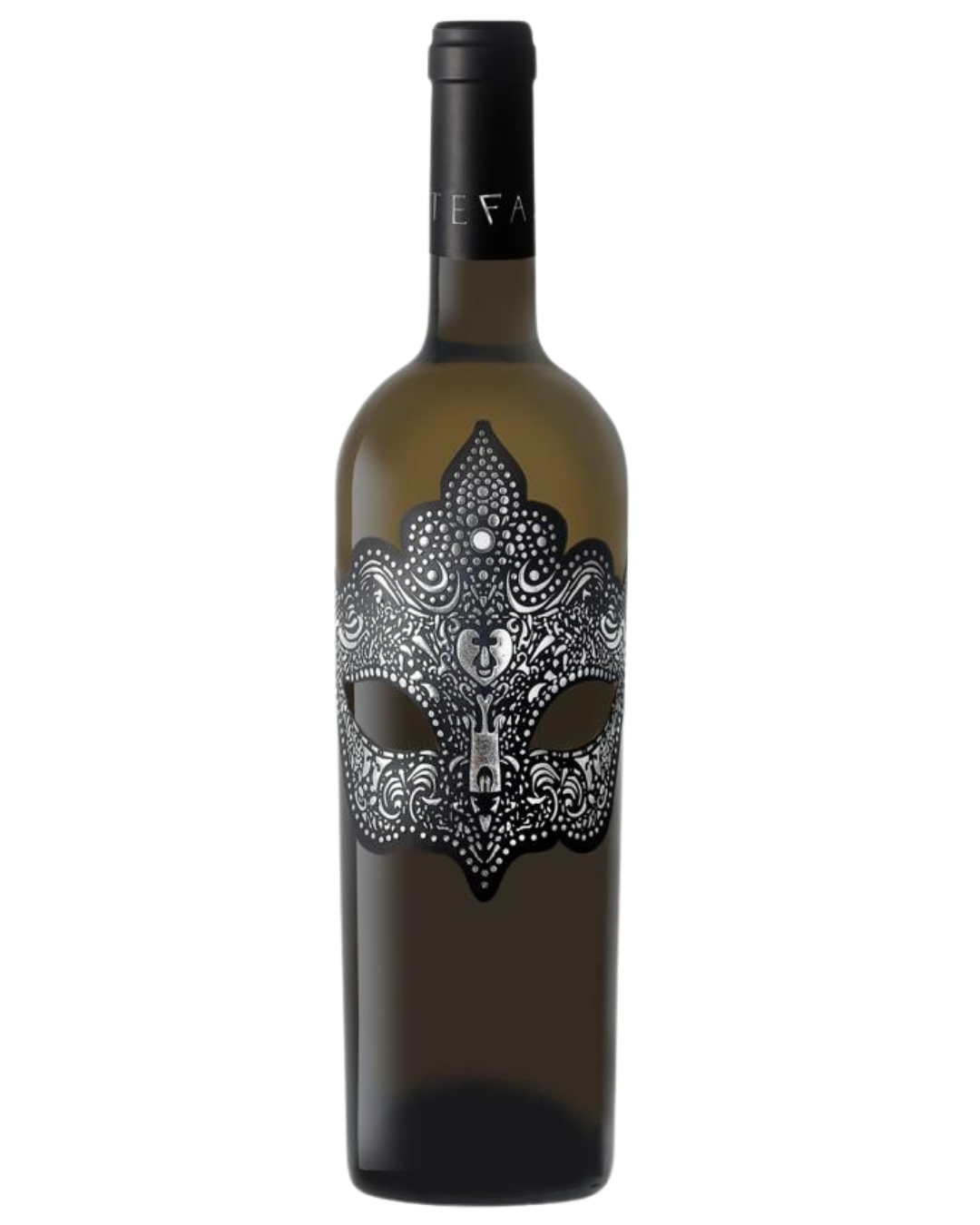 Volte-Face Private selection branco heeft een luxe en opvallend etiket met een zilveren masker erop. De naam van de wijn betekent ‘het andere gezicht’.